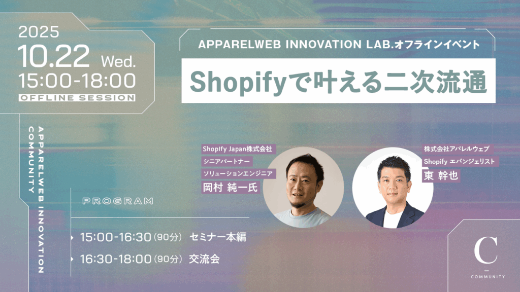 本セミナーでは、Shopify Japan株式会社のシニアパートナーソリューションエンジニアの岡村氏と、Shopifyエバンジェリストの東氏が登壇。Shopifyの最新機能や技術動向をはじめ、国内外の二次流通市場の現状と課題を解説。さらに、海外での成功事例を交えながら、Shopifyの実装方法や成功のポイントを紹介していきます。ブランドや小売事業者のEC担当者の方にとって、持続的な成長戦略としての二次流通の可能性を具体的に描ける機会となります。