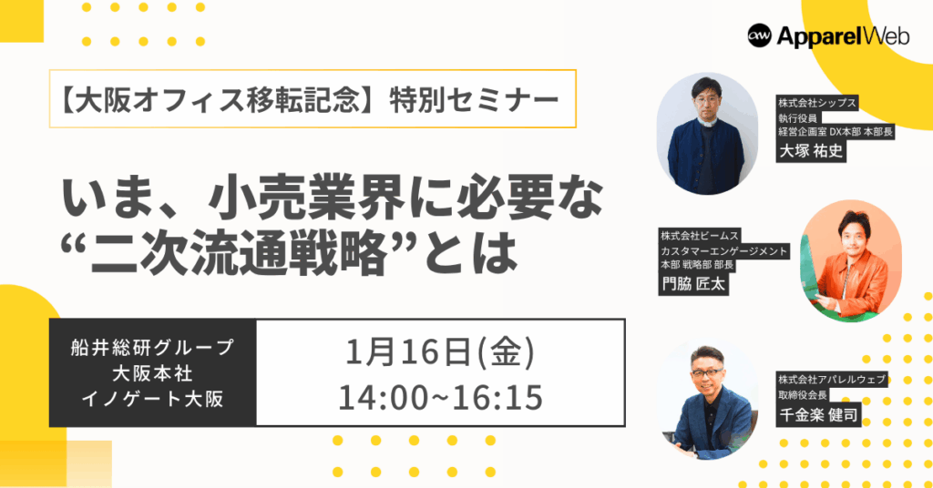 株式会社アパレルウェブ(本社:東京都中央区、代表取締役社長:小平 勝也、以下アパレルウェブ)は、2026年1月16日(金)に株式会社船井総研ホールディングス(東京本社:東京都中央区、代表取締役社長:中谷貴之、以下船井総研ホールディングス)および船井総研グループの大阪本社移転を記念した特別無料セミナー「 いま、小売業界に必要な “二次流通戦略”とは」を開催いたします。