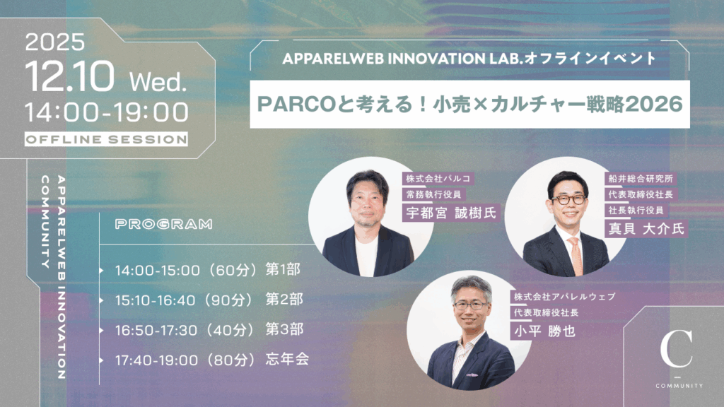 セミナーテーマは「PARCOと考える!小売×カルチャー戦略2026」です。2026年に向けて、小売業は新たなフェーズへと進化しつつあります。本セミナーでは、企業文化や顧客体験、デジタル戦略など、次の時代を切り拓くためのヒントを提言。株式会社パルコ 常務執行役員 宇都宮 誠樹氏、船井総合研究所 代表取締役社長 真貝 大介氏、そして株式会社アパレルウェブ 代表取締役社長 小平 勝也の3名が登壇し、2025年を締めくくるにふさわしい内容をお届けいたします。