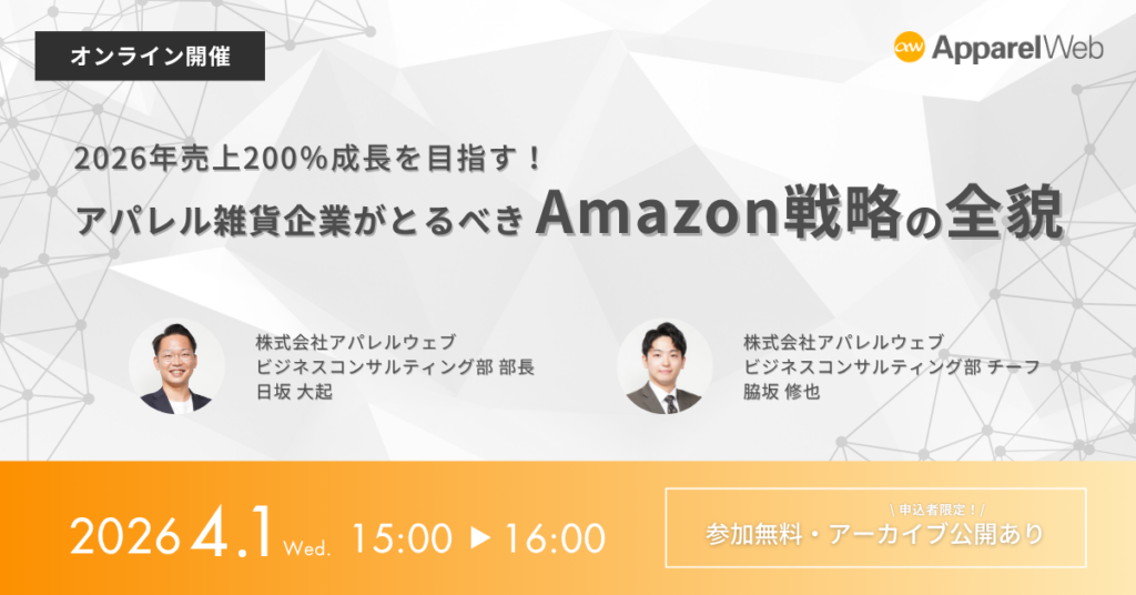 株式会社アパレルウェブ(本社:東京都中央区、代表取締役社長:小平 勝也、以下アパレルウェブ)は、2026年4月1日(水)に無料オンラインセミナー「2026年売上200%成長を目指す!アパレル雑貨企業がとるべきAmazon戦略の全貌」を開催いたします。